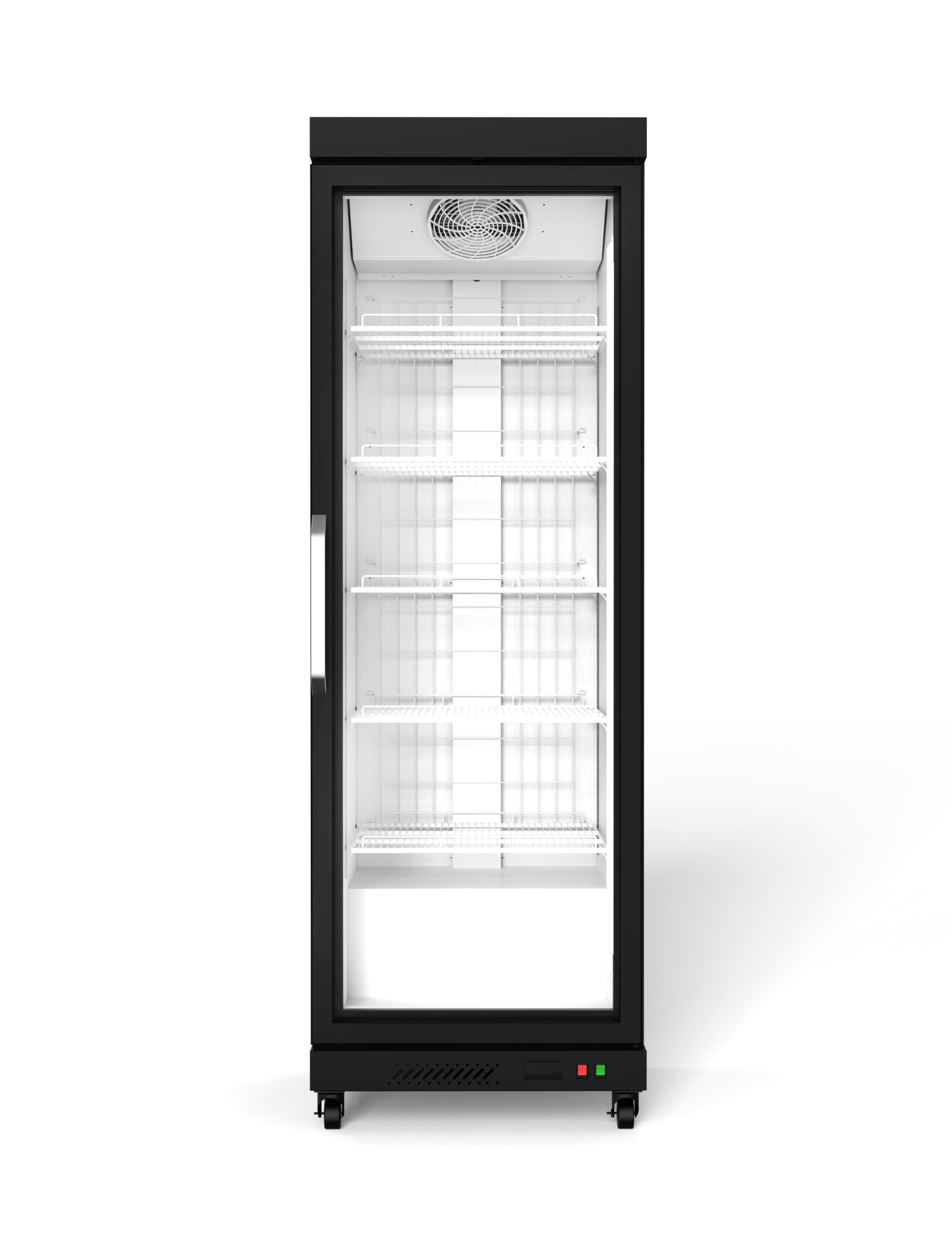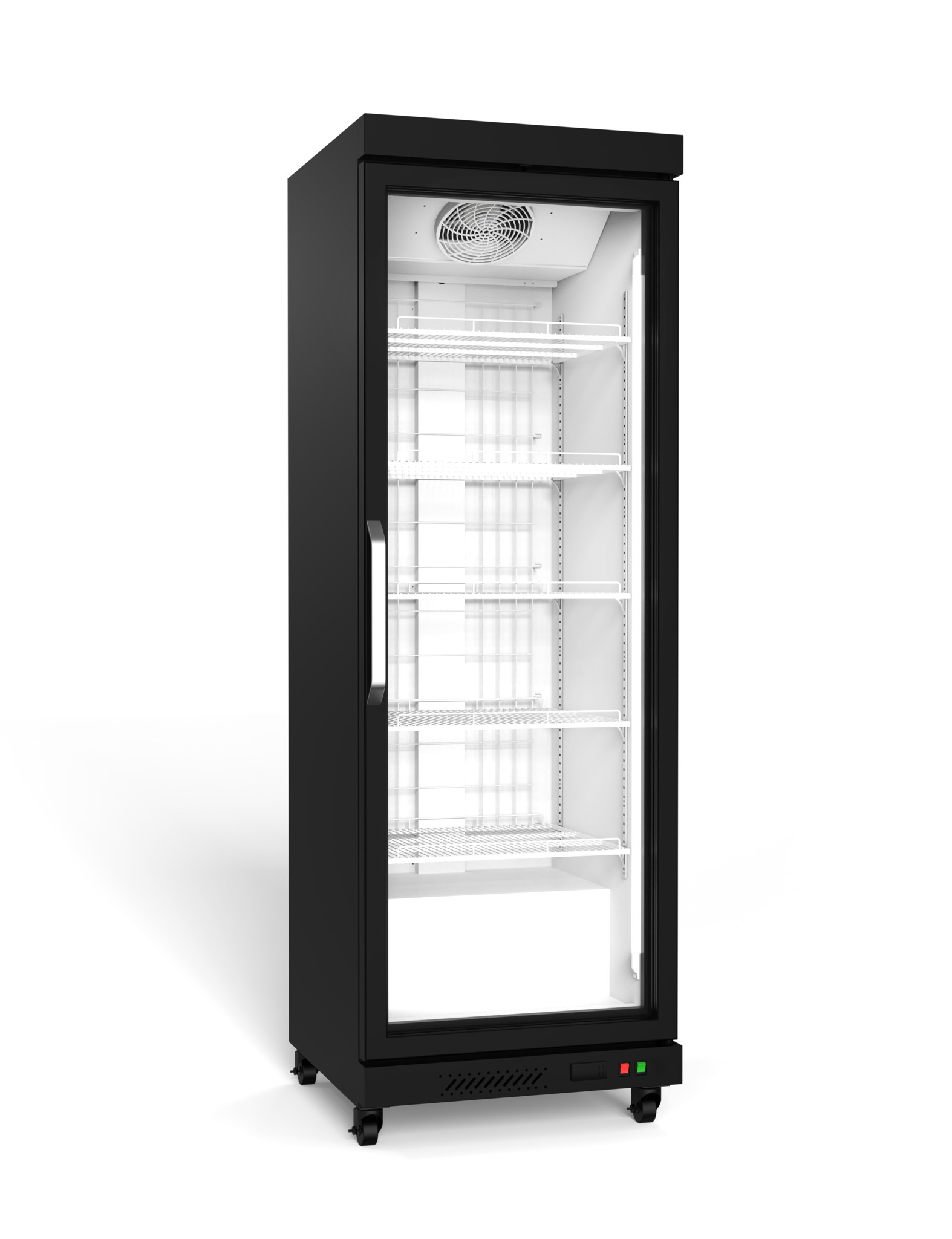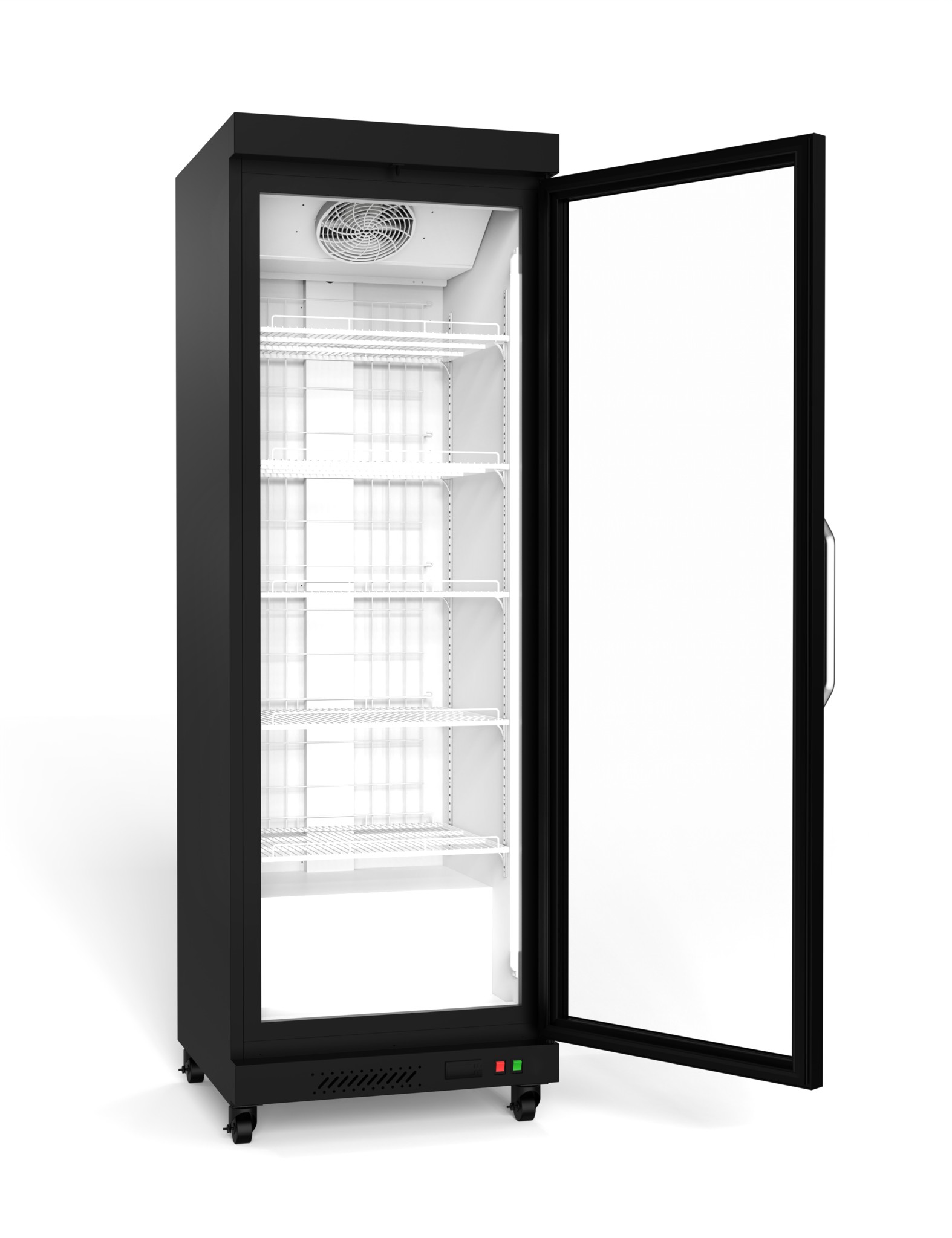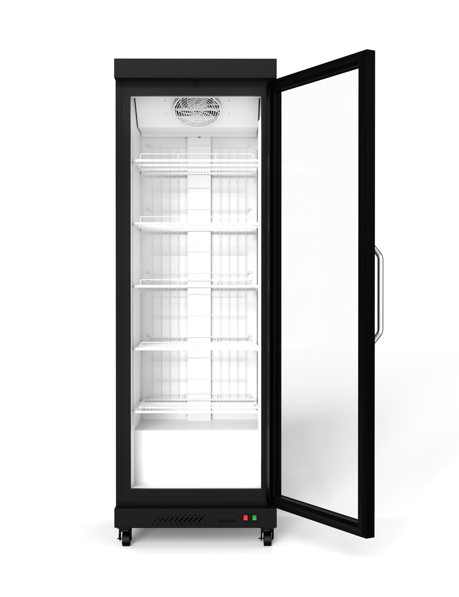 Volně stojící moderní mrazicí vitrína o objemu 487l a s 5 drátěnými policemi.