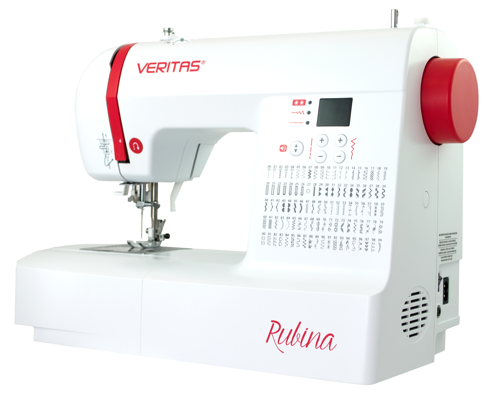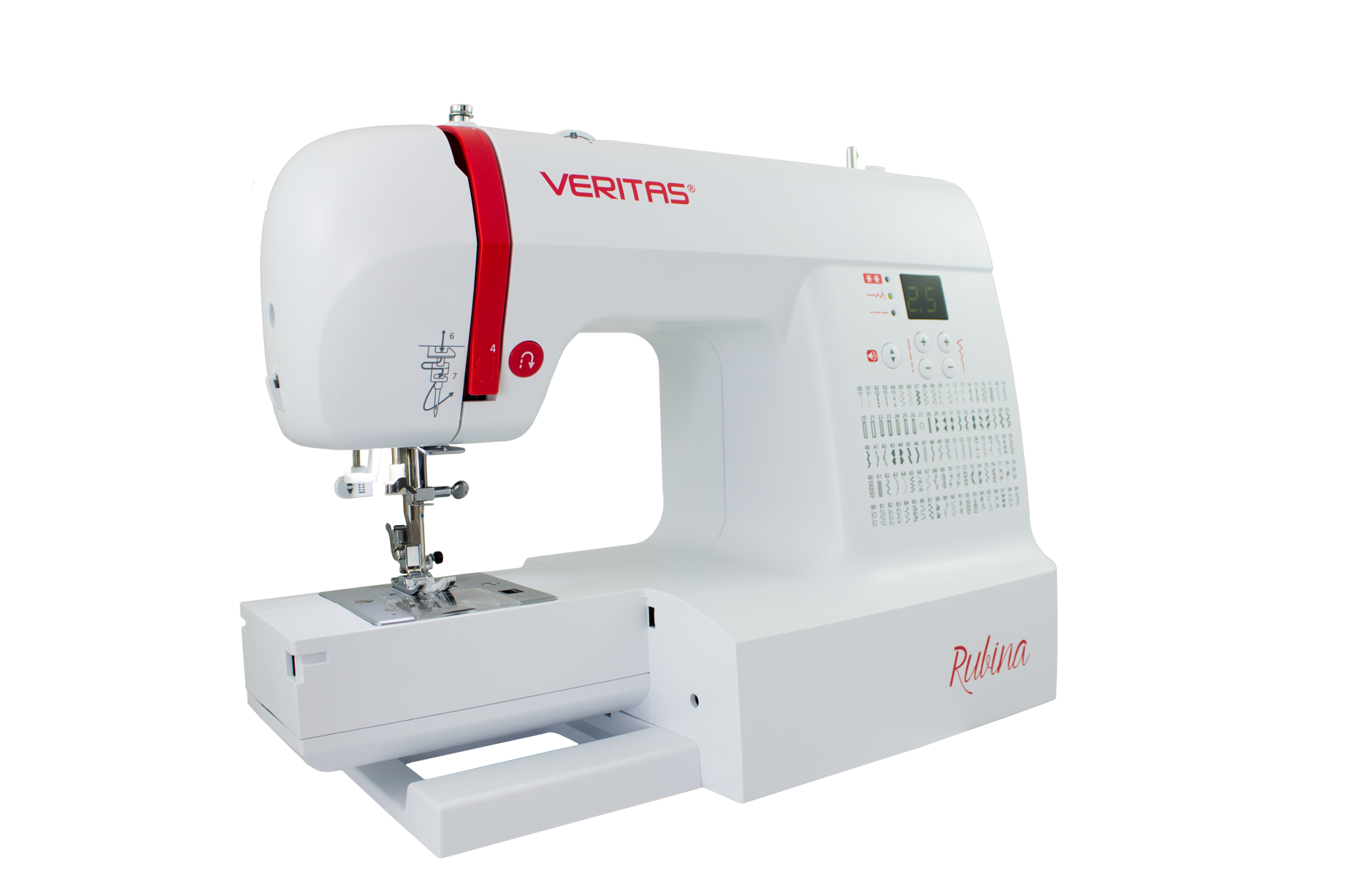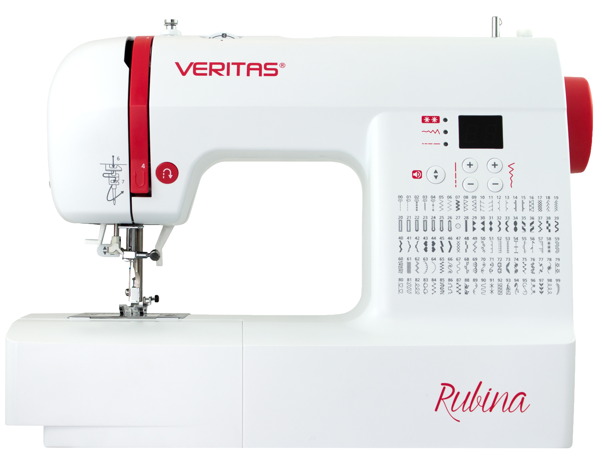 Vybavený 100 šicími programy, které zahrnují užitkové, pružné a overlockové stehy, 7 různých typů knoflíkových dírek a početné dekorativní stehy tak šicí stroj VERITAS Rubina nabízí vše, co potřebujete pro každodenní šití.