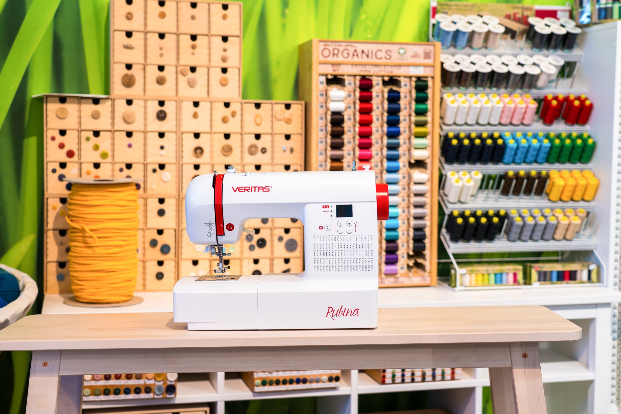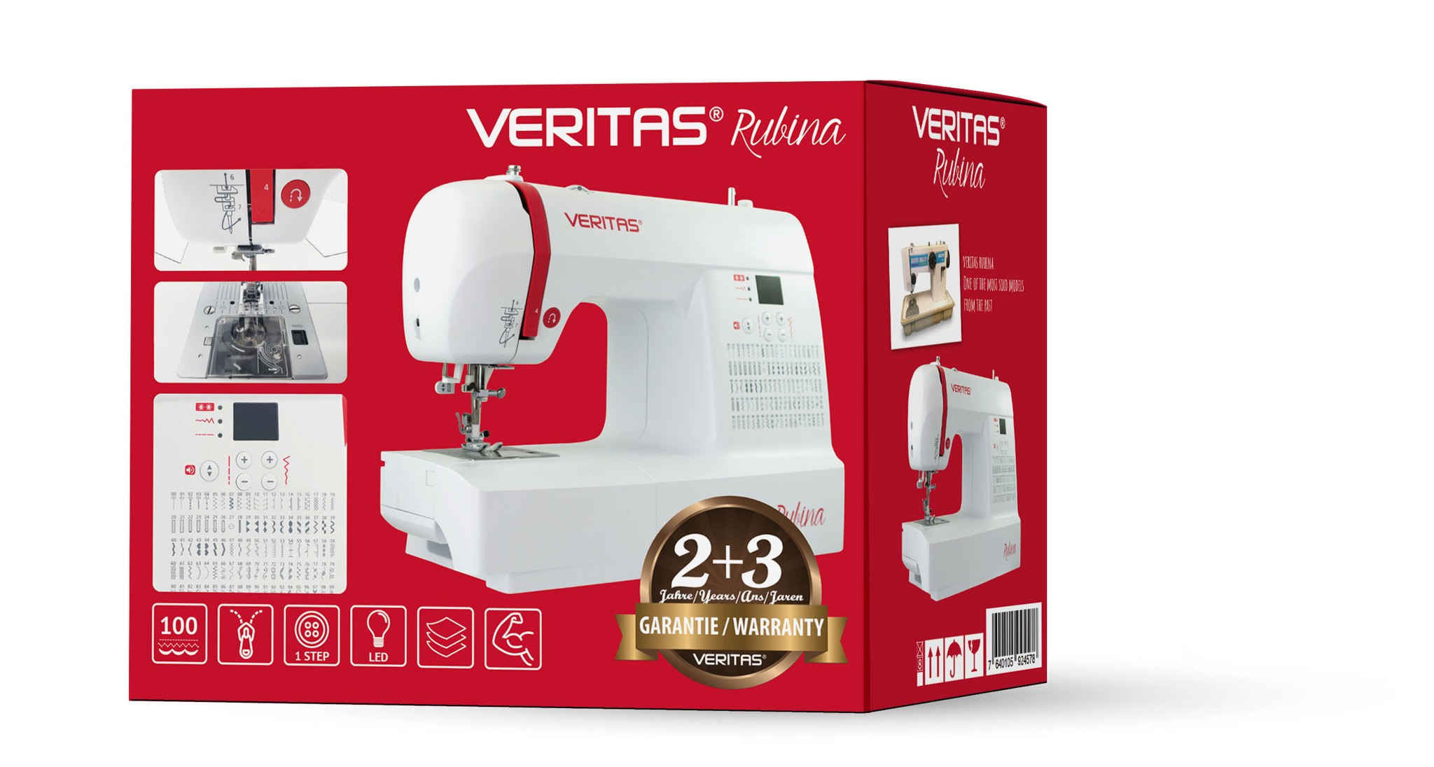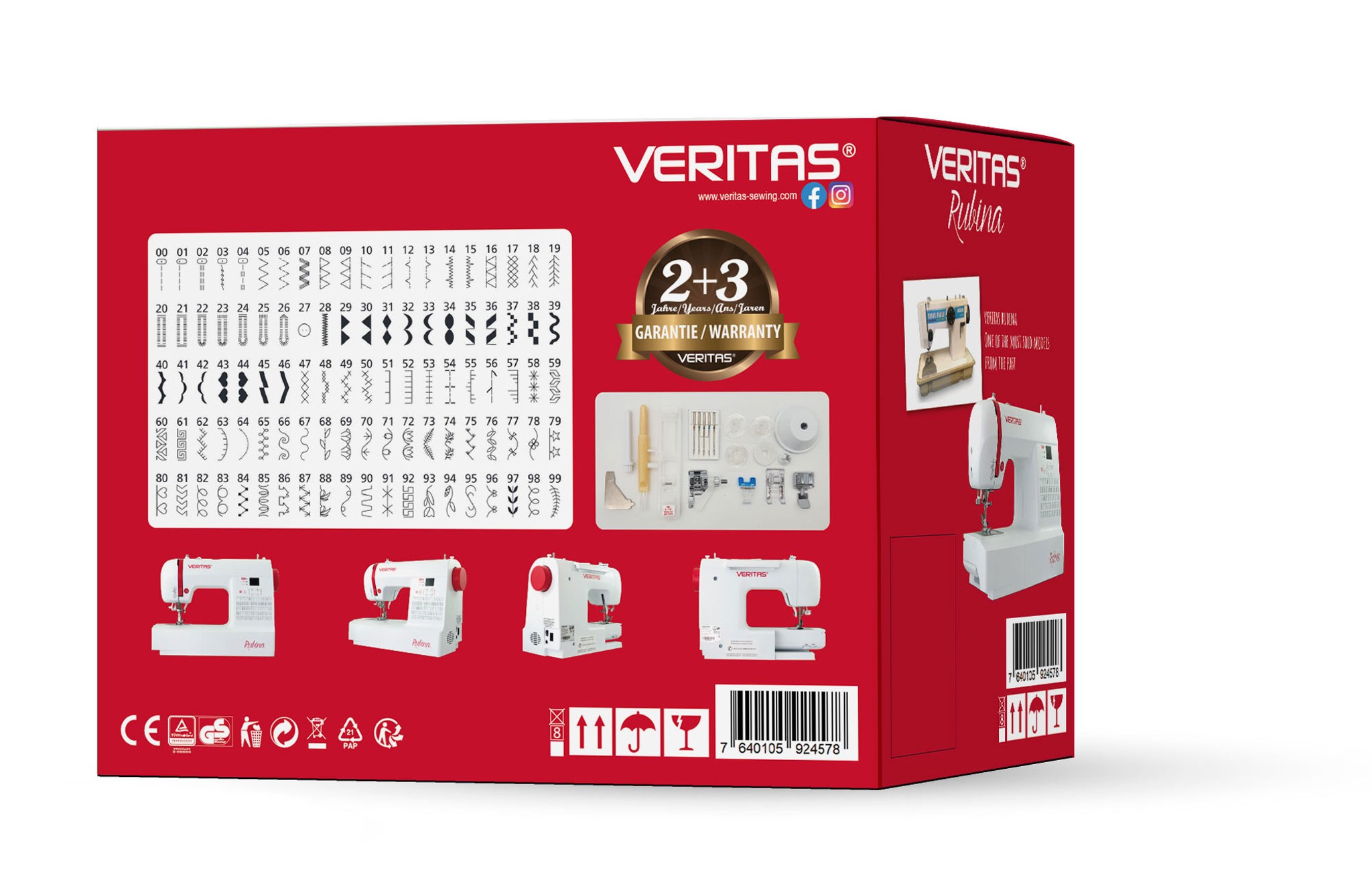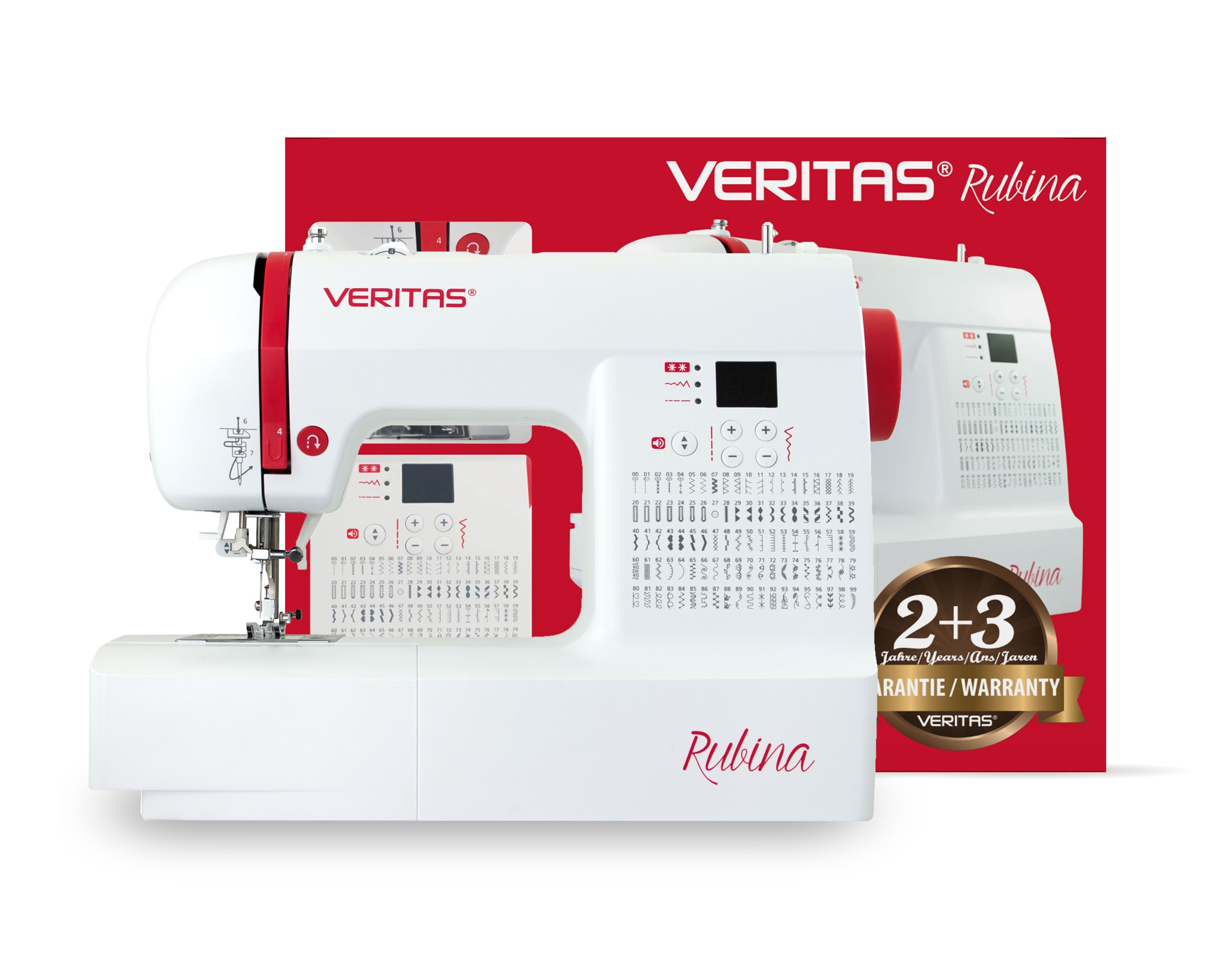 Vybavený 100 šicími programy, které zahrnují užitkové, pružné a overlockové stehy, 7 různých typů knoflíkových dírek a početné dekorativní stehy tak šicí stroj VERITAS Rubina nabízí vše, co potřebujete pro každodenní šití.