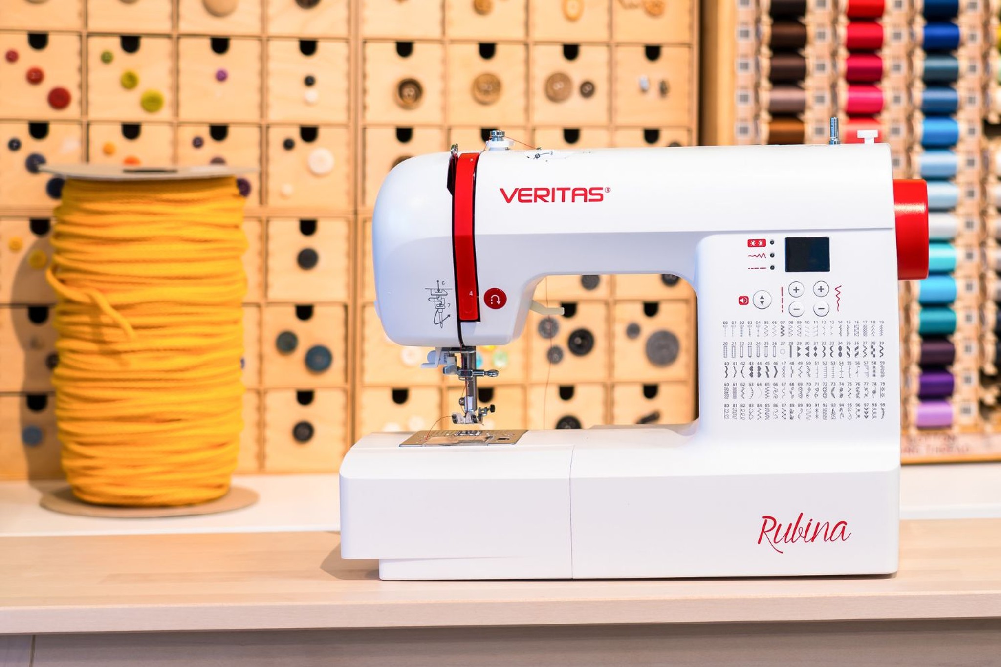 Správná knoflíková dírka pro každou velikost knoflíku: VERITAS Rubina umí ušít 7 různých typů knoflíkových dírek, které přesně odpovídají délkou a šířkou. Díky programovému přednastavení každého ze 100 volitelných typů stehů zvládnete i obtížné zadání bez zdržení. Neoslňující LED osvětlení zajistí dokonalý přehled celé šicí plochy.